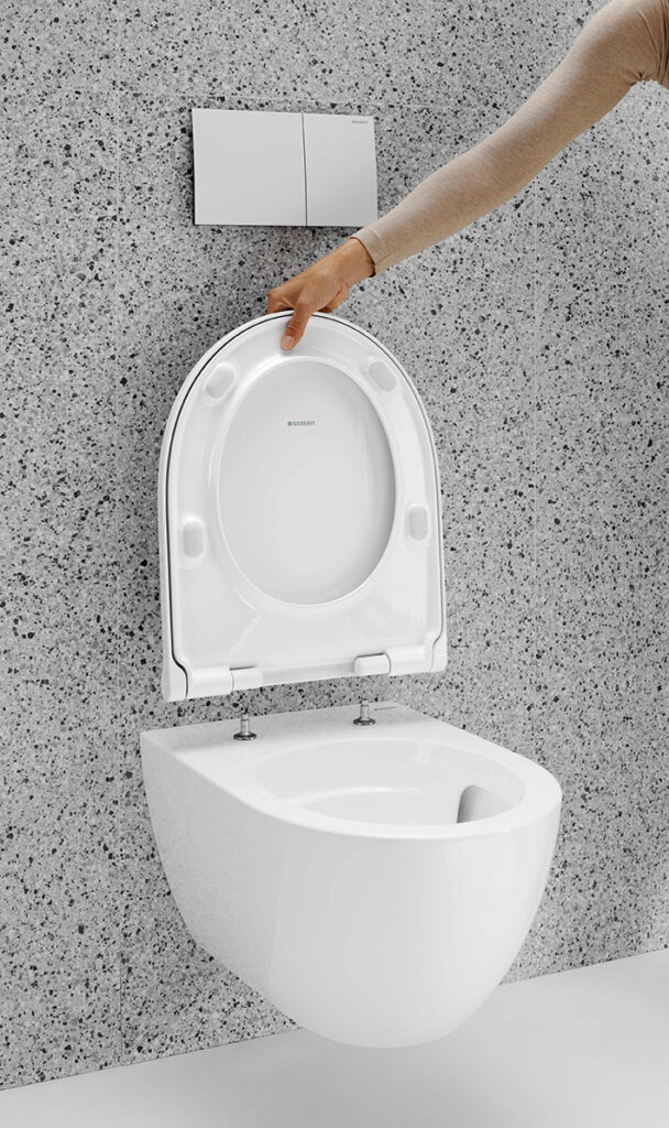 Neben den inneren Werten überzeugt das neue Geberit Acanto WC auch mit äußeren Werten: der WC-Sitz ist nun schlanker als der des Vorgängermodells. Die schlanke Form im Wrap-over Design ist mit einer Absenkautomatik und der QuickRelease-Funktion ausgestattet. Neben dem spülrandlosen Design ist die QuickRelease-Funktion entscheidend für die Reinigungsfreundlichkeit: Der WC-Sitz lässt sich inklusive Deckel mit nur einem Handgriff abnehmen und wieder aufstecken. Dazu werden WC-Sitz und -Deckel auf 90 Grad aufgeklappt und abgenommen. So können Keramik und Sitz hygienisch und vor allem mit weniger Zeitaufwand gereinigt werden – ohne schwer zugängliche Stellen.
